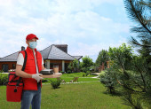 Pracownik z opryskiwaczem owadobójczym w pobliżu zielonego krzewu na zewnątrz. Zwalczanie szkodników