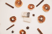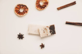 Płaska kompozycja układania z naturalnym ręcznie robionym mydłem i składnikami. Koncepcja spa, salonu lub pielęgnacji ciała i skóry.