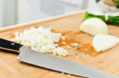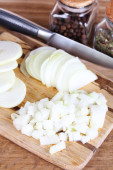 Ręce kobiet cięcia cebuli, na tle kuchni