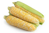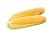 Świeże uszy kukurydzy z liśćmi odizolowanymi na białym tle.