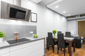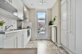 Zdjęcie "Kuchnia z białymi meblami i drewnianą podłogą otwartą na jadalnię z oknem" może być wykorzystywane do celów osobistych i komercyjnych zgodnie z warunkami zakupionej licencji Royalty-free. Obraz jest dostępny do pobrania w jakości wysokiej rozdzielczości do 5760x3840.