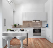 Kuchnia z białymi meblami i drewnianą podłogą otwartą na jadalnię z oknem