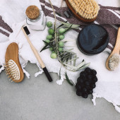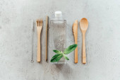Widok z góry na ekologiczne naczynia umieszczone w pobliżu butelki z wodą i liściem mięty na szarej powierzchni kamienia