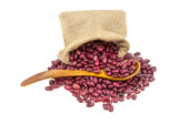 Czerwona fasola w drewnianych naczyniach izolowanych na białym tle