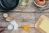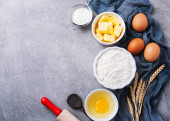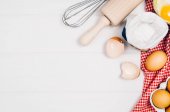 Pieczenie Składnik - mąka, jajko, mleko, wałek pin, tło. Widok z góry, płaski, przestrzeń do kopiowania