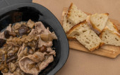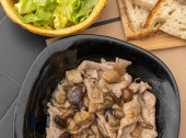Obraz fajitos na żeliwnej patelni na drewnianym stoisku z zabytkowymi sztućcami i warzywami jako dekoracja na ciemnym tle