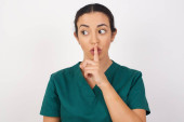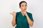 piękna młoda kobieta prosi o ciszę z palcem na ustach wskazującym ręką na bok. Cisza i tajna koncepcja.
