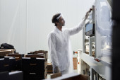 Specjalni pracownicy magazynu badający brokuły zawinięte w folię klejącą