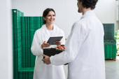 Nadzorca magazynu w lateksowych rękawiczkach i fartuchu laboratoryjnym
