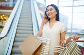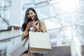 Azjatka młoda kobieta zakupy online ze smartfona. Szczęśliwa kobieta z torbami na zakupy cieszy się zakupami. Dziewczyna trzyma kolorowy papier torba i stoi na schodach.time zakupy koronawirusa kryzysu lub covid19 wybuchu.