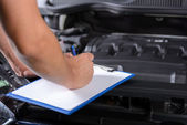 Automatyczny mechanik przy użyciu listy kontrolnej dla systemów silników samochodowych po zamontowaniu. koncepcje wsparcia i usług w zakresie ubezpieczeń samochodu.