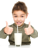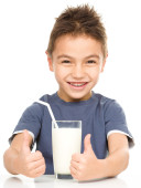 ładny chłopak ze szklanką mleka