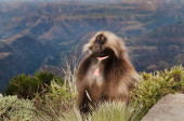 Blisko samicy małpy Gelada (Theropithecus gelada) siedzącej na skale przeciwko błękitnemu niebu w górach Simien, Etiopia.