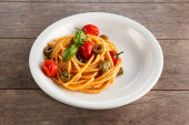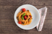 spaghetti z sosem pomidorowym i bazylia w białej misce na ciemnej drewnianej powierzchni