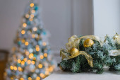 Ozdobiona choinka zbliżenie. Złote kule i podświetlana girlanda z latarkami. Zimowe wakacje dekoracja światła