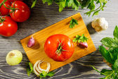 Zdjęcie "Banda soczystych organicznych pomidorów wiśniowych z zielonym rozmarynem, czosnkiem i przyprawami na białym starym stole. Składniki do gotowania. Czysta koncepcja jedzenia. Dieta wegetariańska. miejsce na tekst" może być wykorzystywane do celów osobistych i komercyjnych zgodnie z warunkami zakupionej licencji Royalty-free. Obraz jest dostępny do pobrania w jakości wysokiej rozdzielczości do 5760x3840.