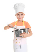 piękna dziewczynka gospodarstwa kuchnia łyżka i pan na białym tle
