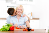mężczyzna całuje ładna kobieta, podczas gdy ona jest gotowanie