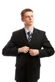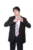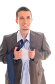 młody biznesmen naderwanie koszulę, odsłaniając kostiumie superbohatera, na białym tle
