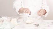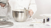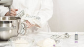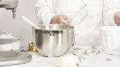 Składniki mieszające w stojącym mieszalniku kuchennym, aby lukier maślany.