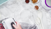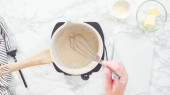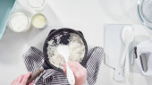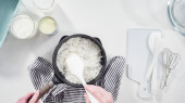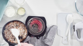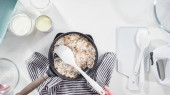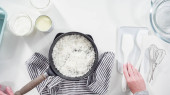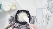 Leżeć płasko. Pieczenie płatków kokosowych w patelni do przygotowania domowych lodów kokosowych.