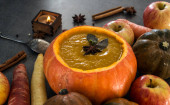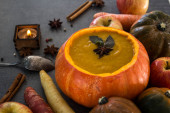 Zupa squash w dyni miski na szarym tle teksturowane z miejsca do kopiowania. Widok z góry zdjęcie jesiennego posiłku z gwiazdami anyżu, rozmarynu, kijów cynamonowych i srebrnej łyżki.