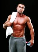 sprawny człowiek w szara Bluza z kapturem pomiaru taśmę i butelki z wodą