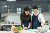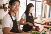Zdjęcie "portret azjatycki mężczyzna szef kuchni ręka w górę w kuchni z kobieta gotowania tle. koncepcja gotowania szefa kuchni." może być wykorzystywane do celów osobistych i komercyjnych zgodnie z warunkami zakupionej licencji Royalty-free. Obraz jest dostępny do pobrania w jakości wysokiej rozdzielczości do 5760x3840.