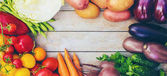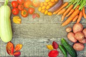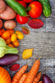 Asortyment różne świeże warzywa organiczne w stylu country drewniane tło. Zdrowe jedzenie wegańskie wegetariańskie koncepcja diety. Miejscowy ogród produkuje czyste jedzenie. Widok z góry płaski lay banner