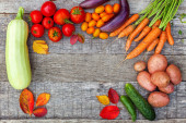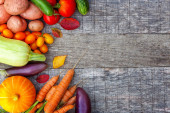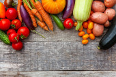 Zdjęcie "Asortyment różne świeże warzywa organiczne w stylu country drewniane tło. Zdrowe jedzenie wegańskie wegetariańskie koncepcja diety. Miejscowy ogród produkuje czyste jedzenie. Widok z góry płaski lay banner" może być wykorzystywane do celów osobistych i komercyjnych zgodnie z warunkami zakupionej licencji Royalty-free. Obraz jest dostępny do pobrania w jakości wysokiej rozdzielczości do 5760x3840.
