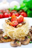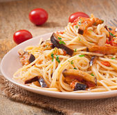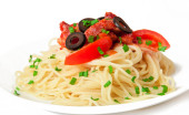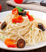 spaghetti z pomidorami i oliwkami
