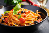 spaghetti z pomidorami i oliwkami