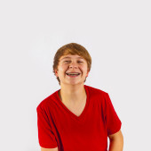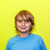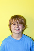 szczęśliwy uśmiechnięty młody chłopiec z żółtą ścianą
