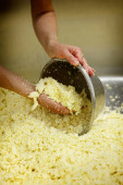 Robotnik wciskający twarożek do formy w fabryce sera, zbliżenie