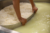 Robotnik oddzielający twarożek od serwatki w zbiorniku w fabryce sera, zbliżenie