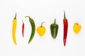 Czerwone chili, zielona żółta papryka chili plastry / cut / half izolowane w białym tle, kładzenie lnu, widok z góry, tajskie chili w białym stole