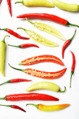 Czerwone chili, zielona żółta papryka chili plastry / cut / half izolowane w białym tle, kładzenie lnu, widok z góry, tajskie chili w białym stole