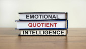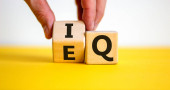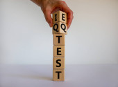 Ręka odwraca sześcian i zmienia wyrażenie 'IQ' na 'EQ'. Piękny żółty stół, białe tło. Koncepcja współczynnika emocjonalnego i inteligencji. Przestrzeń kopiowania.