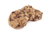 Trzy ciasteczka z mąki pszennej z kawałkami czekolady na białym tle.
