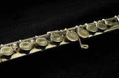 zbliżenie na szczegóły saksofonu altowego, czarne tło, krótka głębia ostrości.