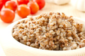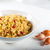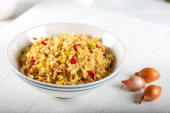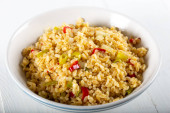 Pilaf gryczany (pilav) z warzywami w naczyniu na drewnianym tle.