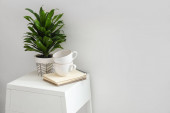 Nowoczesna komoda z rośliną i koszem w pobliżu ściany światła w pokoju