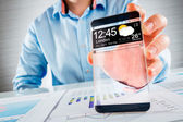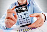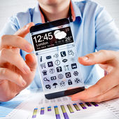 smartphone rezygnować przeźroczysty ekran w ludzkich rąk.