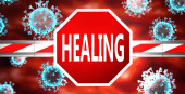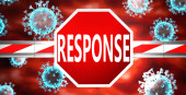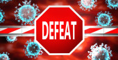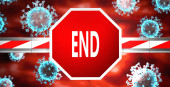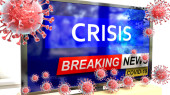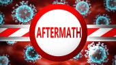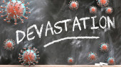Katastrofa i covid, obrazowane przez słowo Katastrofa i wirusy symbolizujące, że Katastrofa jest związana z pandemią koronawirusów, ilustracja 3D