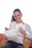 dziewczyna przez okna, uśmiechając się i posiadających magazynu