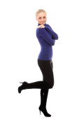 Młoda atrakcyjna kobieta posiada coś na białym tle nad białym