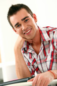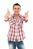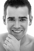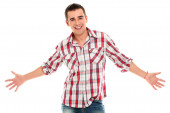 Przystojny i pozytywny człowiek odizolowany na białym tle studia