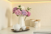 Zdjęcie "Bukiet z pięknymi purpurowymi kwiatami hortensji i słoikami na lekkim blatze" może być wykorzystywane do celów osobistych i komercyjnych zgodnie z warunkami zakupionej licencji Royalty-free. Obraz jest dostępny do pobrania w jakości wysokiej rozdzielczości do 5760x3840.