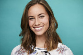 Portret młodej, pięknej, szczęśliwej kobiety uśmiechniętej