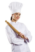 gotować kobieta w mundurze z pieczenia wałkiem na białym tle